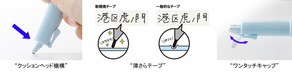 安定したグリップ感のある形状に加え、使い始めから終わりまでテープを引く力を適正な荷重に制御する独自機構“ファインキーパー”を採用。さらに紙面への密着性を高める“クッションヘッド機構”、紙面との段差が少なく、きれいに上書きできる“薄さらテープ”を搭載し、これら独自技術の融合で、快適な使い心地を追求しました。