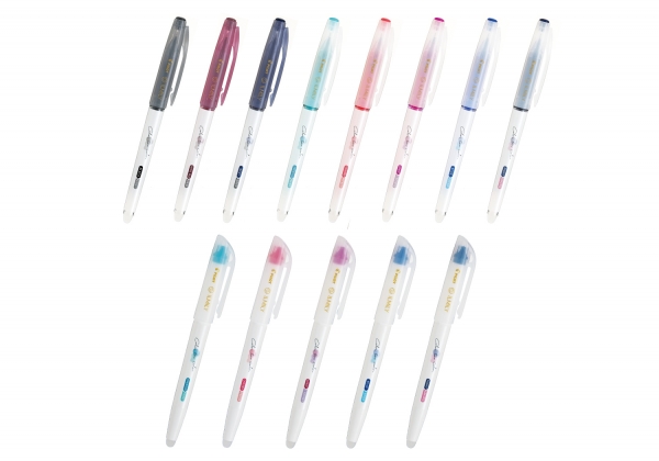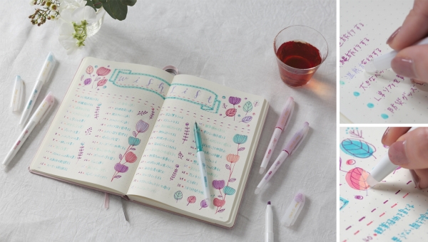 ペン後部の専用ラバーでこすると筆跡の色を変化させることができるマーカーです。インキ色は同系色で濃い色から薄い色へと変わる3色と、数量限定の2色を加えた計5色をラインアップしました。ノートや手帳へのデコレーションやマーキングはもちろん、色の変化で2色を楽しめるため紙面を華やかに彩ることができます。
