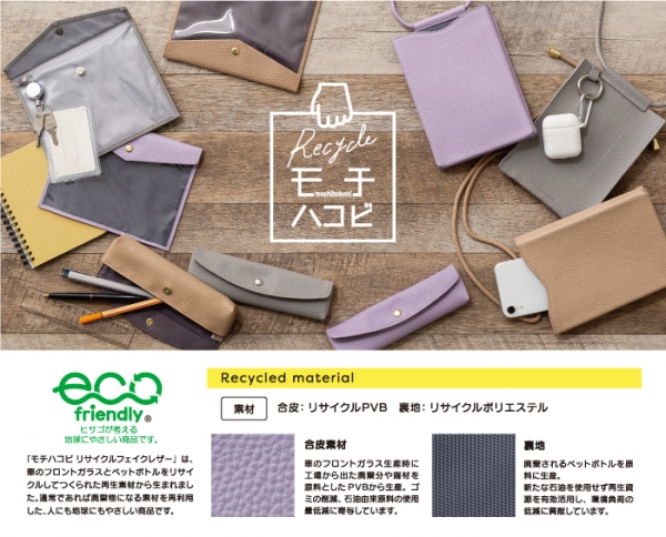 ホーム > 新製品情報・特集 > ヒサゴ、車のフロントガラスとペットボトルから作られたリサイクルフェイクレザー「モチハコビ」シリーズ