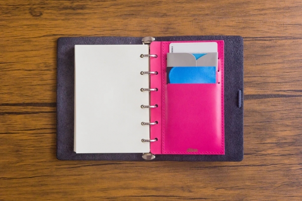 ミニ6システム手帳ユーザーの声を反映した、両面に薄くコンパクトに収納できるカードケースです。名刺やショップカード、クレジットカードなど様々なサイズに対応しています。