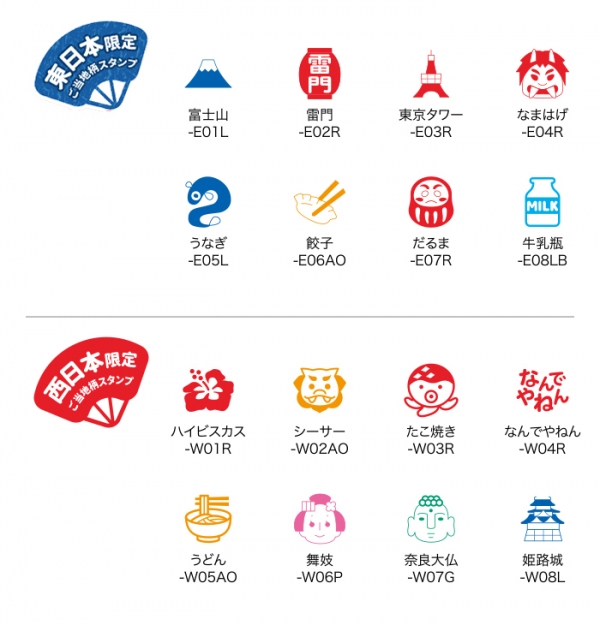 富士山(山梨県・静岡県)、雷門(東京都)、東京タワー(東京都)、なまはげ(秋田県)、うなぎ(静岡県・愛知県)、餃子(栃木県・静岡県)、だるま(群馬県)、牛乳瓶(北海道)/計8種