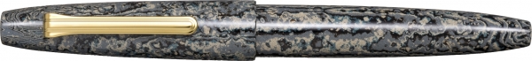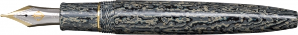超大型の21 金長刀研ぎペン先を搭載し、重ねたエボナイト材にチラシ細工を施した重厚感のあるエボナイト万年筆「雪景」。