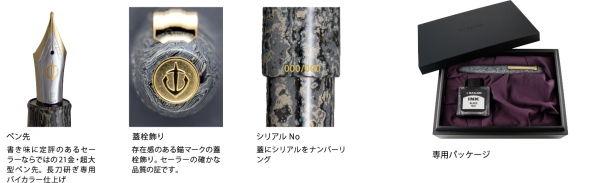 また、シリアルナンバーを刻んだ特別仕様として、同じものが世界中に二つとない限られた逸品となります。しっとりと手になじむ美しいエボナイト材の感触と唯一無二の長刀研ぎペン先のなめらかな筆記感をお楽しみください。