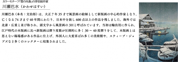 本体には美しい雪景色を描いた浮世絵、川瀬巴水の「雪の向島」をモチーフにイメージしたカラーエボナイト材を採用しております。かつて巴水は雪の描写について、「皆一様に点体のみで降る雪を現してゐる様です。それではどうも物足りませんので、一つもう一層真実に近いものにしたい」と語っていました。幾層にも重ね、複雑に織りなすカラーエボナイト軸にて表現した風合いをご堪能ください。