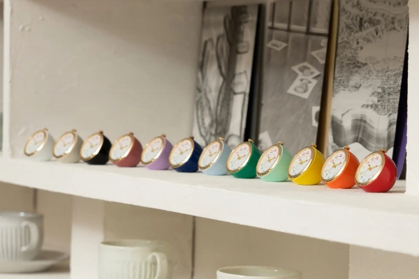 約4cmの小さなサイズの置き時計は全12色展開です。
