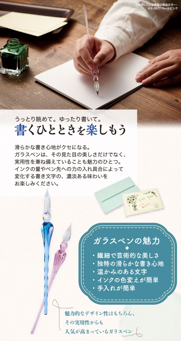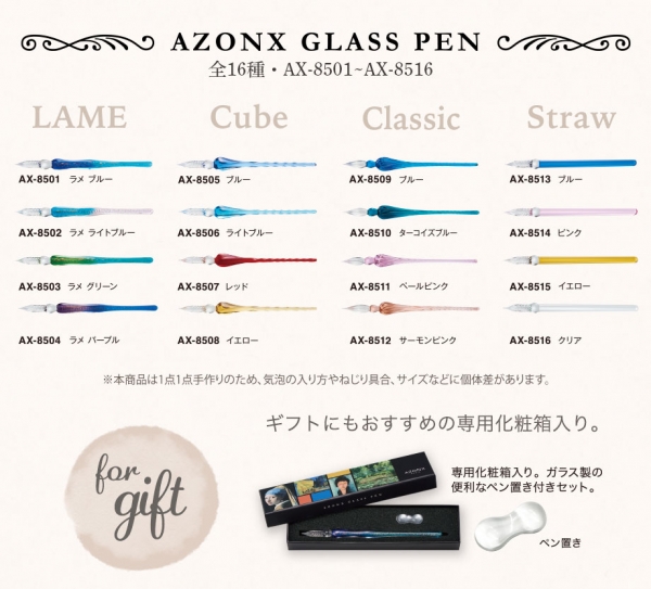 「アゾン ガラスペン」は、ガラス素材特有の透明感と繊細なフォルムが美しく、なめらかな書き心地のガラスペンシリーズ。