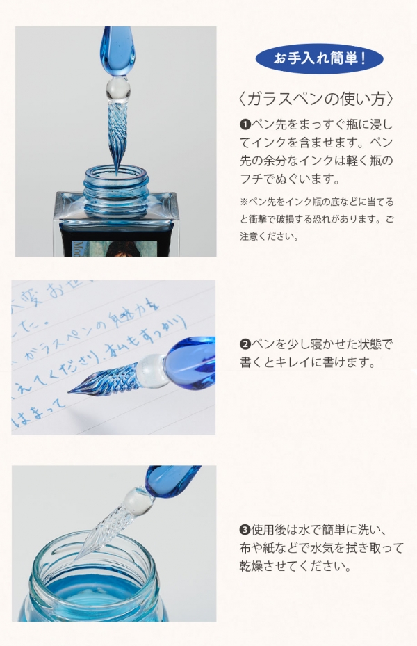 ●なめらかな書き心地で初めてでも使いやすい、ペン置き付きガラスペン。