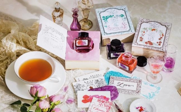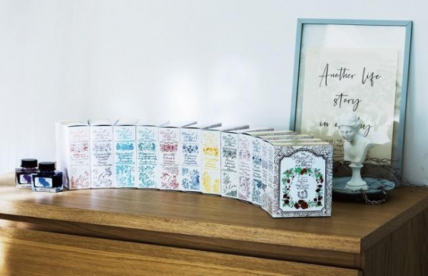 カリグラフィーデザイナーの備魚円香による監修で、色選びや色名、パッケージやカードのデザイン・イラスト制作など、アンティーク感あふれる美しい世界観を表現しています。インクは、墨や書道用具メーカーの老舗・株式会社 呉竹によるものです。美しい表現を可能にする、国産インクの信頼の品質と美しいインクの発色を堪能できます。