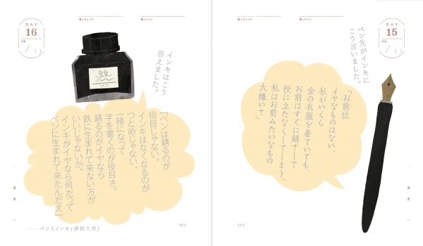名文や詩、俳句、イラストなどを1日1ページ好きなインクでなぞれるなぞり書き帖で、近年人気が高まっているガラスペン、万年筆を使ってなぞり書きを楽しむことが出来ます。