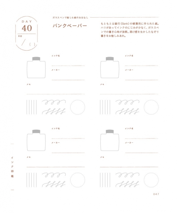 インクファンにはきっとたまらないであろう、インクの試し書き&コレクションができるページも。自由に書き込んで愉しむ日記風のページは、手帳に貼ってみるのもいいかもしれません。