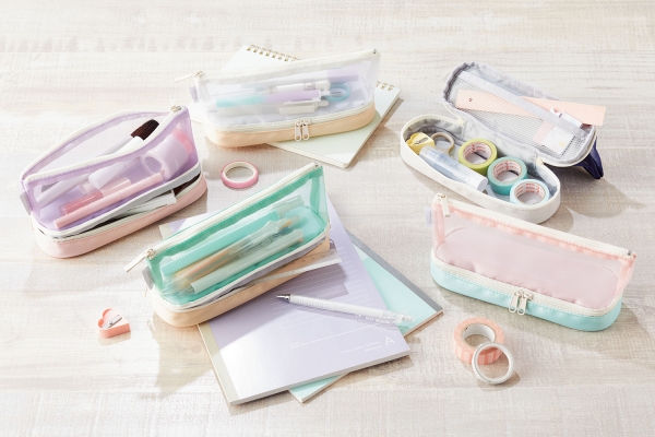 2022年1月に発売して好評だった「2レイヤーペンケース メッシュ」を今回は淡いくすみカラーも取り入れたバイカラーの新色5色で展開。メインの収納スペースがメッシュ素材なので中身が見えて使いやすく、カラーコーデが楽しめるのが特長のひとつです。