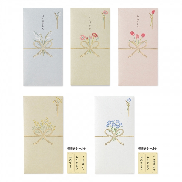 デザインは「スズラン」「ガーベラ」「チューリップ」「ミモザ」「ネモフィラ」の全5種類です。「スズラン」「ガーベラ」「チューリップ」は、それぞれの花言葉に合った表書きを組み合わせています。表書きがない「ミモザ」と「ネモフィラ」には表書きシールが付属しています。表書きシールは「おめでとう」「ありがとう」「こころばかり」の3種類で、それぞれの場面に合わせてふさわしい表書きを選んで使用することができます。