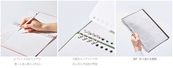 「リングノート テフレーヌ」は、ルーズリーフの差し替えが可能なリングノートです。とじ具のリングが上下にセパレートしているため、書くときにリングが手に触れません。また、リングをつまむだけでとじ具を開けることができ、市販のルーズリーフの追加・差し替えが可能です。