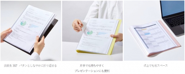 「クリアーファイル パタント」は、やわらかい背パーツを採用しているため、表紙を360°折り返すことが可能な閲覧性の高いクリアーファイルです。表紙を折り返せるため片手でも持ちやすく、プレゼンテーション時の使用にも便利です。また、狭いデスクの上でも省スペースで使用できます。