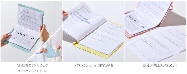 「クリアーファイル コンパック」はA4サイズの書類を半分のサイズに折りたたみ、コンパクトに持ち運べるファイルです。折りたたんでも書類に折り目がつきにくい設計で、開くと通常のクリアーファイルと同様に、書類をパラパラとめくって閲覧できます。