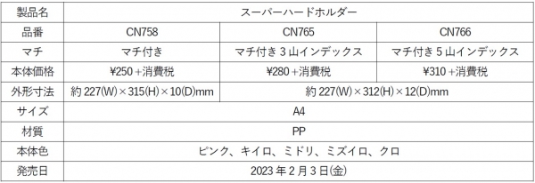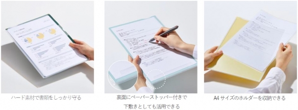 「スーパーハードホルダー」は丈夫なシートを採用した、書類をしっかり保護するハードなホルダーです。厚さ1.3mmの丈夫なシートを採用し、本棚・引き出し・カバンの中でも書類を折れ曲がりから保護します。また、裏面には書類ストッパーが付いており、下敷きとしての使用も可能です。3山と5山のインデックスタイプは、書類の分類にも便利です。