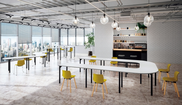 単体でも使用できるベーシックなスクエアタイプなど、4種類の天板形状をラインアップ。曲線を活かしたダイナミックなレイアウトは、オフィスのオープンなスペースに適しています。空間に軽快さや動きを感じさせるとともに、自然な人と人との交流が生まれます。