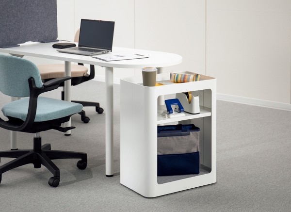 ソロワークスペースとして使う場合は、周囲からの気になる視線を適度に遮る「デスクトップパネル」、個人の荷物や共有の文房具を収納できる「デスクアンダーラック」を組み合わせるのがおすすめです。