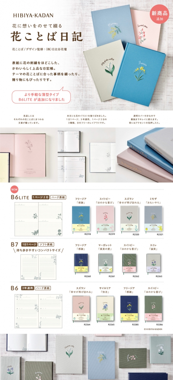 花のプロフェッショナル、日比谷花壇とのコラボで生まれたステーショナリーシリーズ「花ことば日記」に、より手軽な薄型タイプB6 LITEが加わりました。