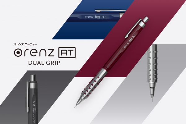 「オレンズAT デュアルグリップタイプ(以下、オレンズAT)」は、1960年にノック式シャープペンを生み出したぺんてるによる、自動芯出し機構搭載シャープペンの新モデルです。