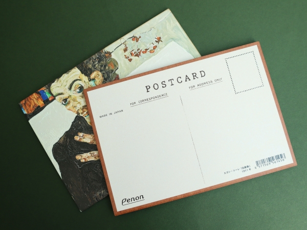 床に座って挑発的なポーズで視線を送る女性はシーレの妻エーディトがモデルになっており、色鮮やかな赤い髪と緑の服が対照的に描かれています。シーレ独特のゆがんだ線描写を凹凸で引き立たせながら、女性の体にはあえて大きな起伏をつけずに、なめらかな肌の質感を表現しています。見る人に強烈な印象を残す原画の世界観をそのままポストカードとペンに閉じ込めました。