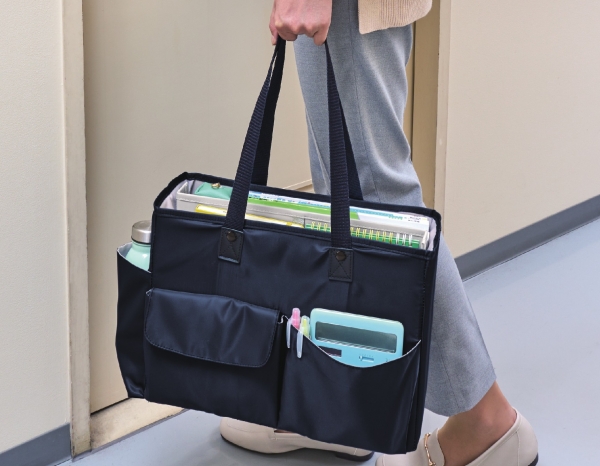 学校の先生が教室間を移動する際、チョークや教材、出席簿など多くの荷物をまとめて持ち運べる「先生用持ち運びバッグ」は2016年に発売され、多くの教育現場従事者から支持をいただいております。この度、教育現場で働く教員の方々により快適に使っていただけるように、生地やポケット数などを見直し、ノートPCやタブレット端末が収納できるクッション付のポケットも追加するなど機能を改善してリニューアルしました。さらに、画用紙や大きめの資料も入る「B4対応」サイズを新たに展開するなどバリエーションも強化しています。