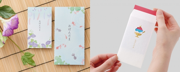 お盆⽟は、“お盆に帰省した際に⼦どもや孫、祖⽗⺟へお⼼付けやお⼩遣いを贈る習慣”を当社がお正⽉の⾵物詩である「お年⽟」にちなんで名付けた造語です。2010年頃より、夏の季節に合わせてデザインしたぽち袋を『お盆⽟』という名称で販売を開始しました。以降、お盆⽟を夏の新しいコミュニケーションとして提案しています。