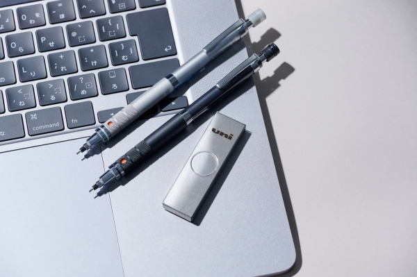 スクエアな形状やアイコンとなっているケース正面の円形のくぼみなど、既存の『uni(ユニ)』のデザインコンセプトを維持しながらさらに要素をそぎ落とし、よりミニマルなデザインに仕上げました。ケースから芯径・硬度表示をなくし、uniロゴのみをレーザー印字することで、メタルの素材感を生かしたスタイリッシュな外観となっています。