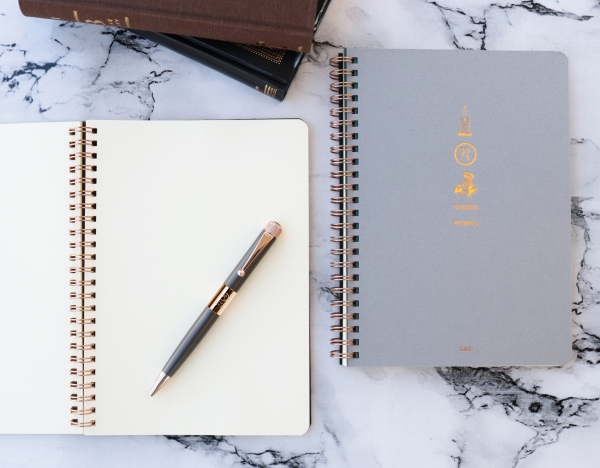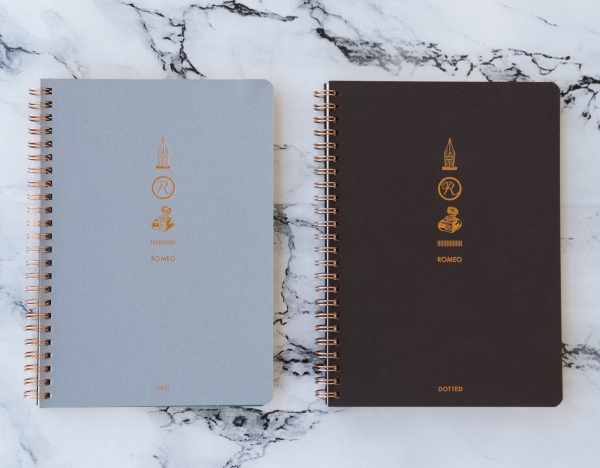 実用性と機能美を兼ね備えたROMEO No.3ボールペンの書き心地をさらに引き立たせるのは、本革をイメージした高級感のある表紙にカッパーカラーのリングと精緻な箔プリントが上品な輝きを放つ「ROMEO Wリングノート」。ブランドにふさわしい高級感をまとった、上質なノートです。筆記用に開発された用紙のすべるようななめらかさには、紙によってこんなにも書き心地が変わるのかと驚かされることでしょう。