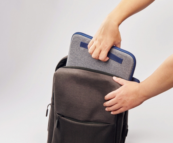 スリムなのでインナーケースとして使用でき、リュックなどへ縦方向に入れる際に出し入れしやすい取っ手付きです。ケース内部は、PC本体を傷つけにくいやわらかな起毛裏地を採用。開口部はL字型に大きく開き、PCの出し入れがスムーズです。また、背面は薄型のポケット付きで、A4判の書類などを収納できます。