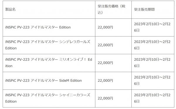 本コラボレーションでは、ミニフォトプリンター「iNSPiC PV-223」のホワイトのボディに、人気アイドルプロデュースゲーム「アイドルマスター」の5つのブランド「アイドルマスター」・「シンデレラガールズ」・「ミリオンライブ!」・「SideM」・「シャイニーカラーズ」のブランドロゴをあしらったオリジナルデザインの着せ替えプレートを装着した5種のモデルを発売します。2023年2月10日から2月26日まで「アソビストア」(バンダイナムコエンターテインメント公式エンタメコマースサイト)にて受注販売します。