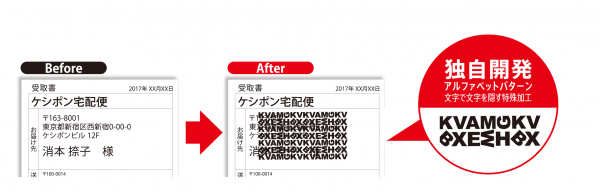 「ケシポン」シリーズはインクで塗りつぶすのではなく、文字で文字を隠すことが特徴的な製品です。縦、横、斜めと独特の配列で並んだ10文字のアルファベットパターンを文字に重ねることにより、記載されている文字情報を読み取りにくくすることができます。