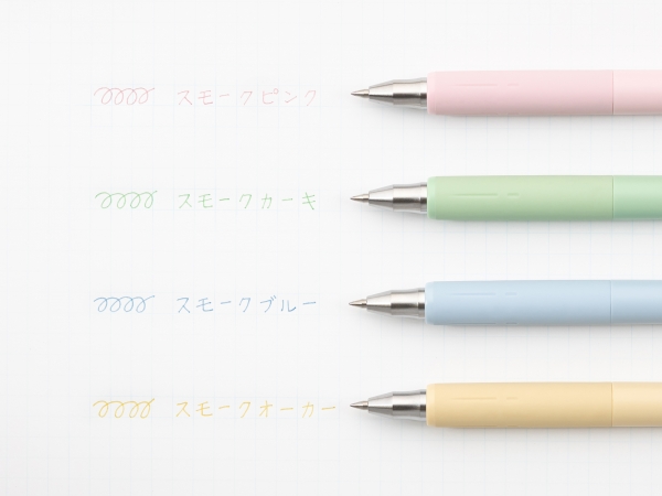 『サラサナノ スモークカラー』 価格:¥220(税抜価格:¥200) ジェルボールペン 水性顔料・耐水性ボール径:0.3㎜ インク色:スモークピンク、スモークカーキ、スモークブルー、スモークオーカー