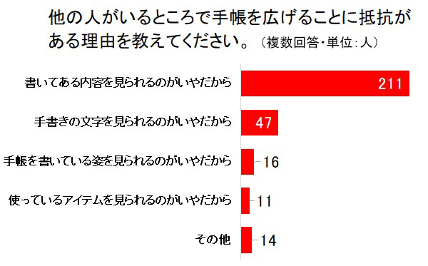 約60%の人が手帳に書いてある内容を見られることを理由に、他の人がいるところで手帳を広げることに抵抗を感じていることがわかりました。