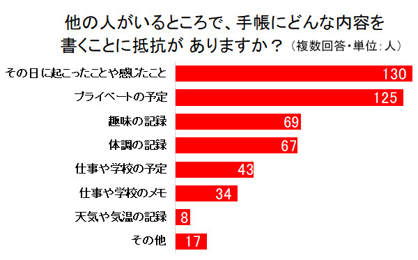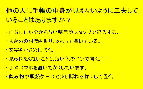 中でも、「その日の出来事」「プライベートの予定」「趣味や体調の記録」が、他の人に見られたくないと多くの人が回答し、「記号や付せんを使う」などで、他の人に手帳が見えないように工夫していることがわかりました。