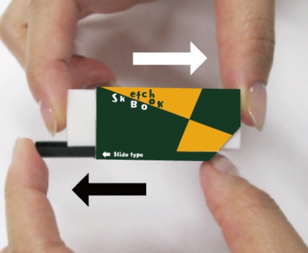 「スライド消しゴム・図案柄」は2種類の消しゴムをスライドさせて用途ごとに使い分けられる