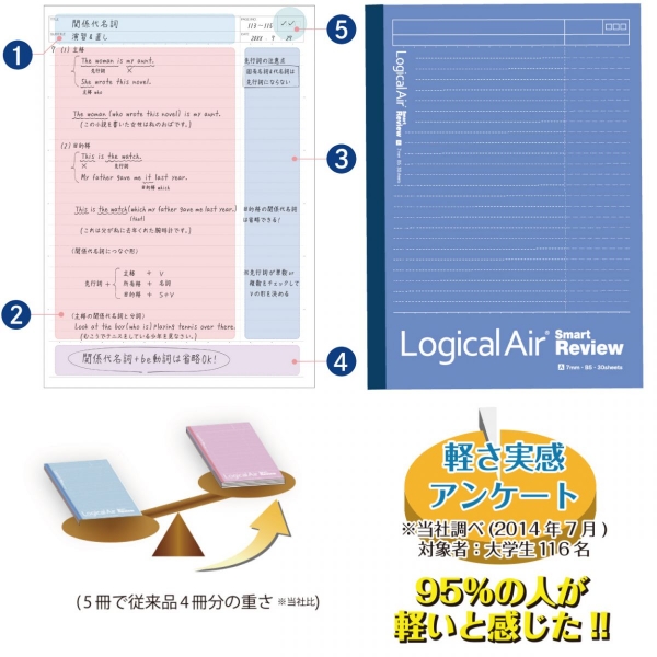 「ロジカルエアー・スマートレビュー」は復習に便利な5つの機能スペース(スマートレビュー復習罫)を搭載し振り返りや復習などに活用できる