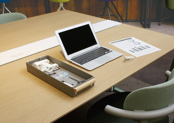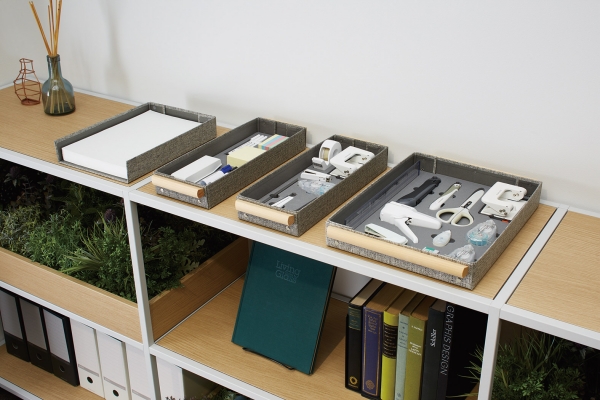 オフィスに必要な基本的な文具を、ひとつのトレーに整列した状態で収められるセット。