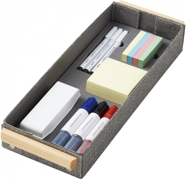 トレーの表装には、ノート等の紙製品を生産する際に発生する紙端材を再生して作った布を、トレーの引手には、「結の森」のヒノキ間伐材を使用しています。(※「結の森」とは、森をめぐる環境と経済の好循環を実現するため、コクヨと四万十の森林組合、高校生、地元や行政が協力しながら取り組んでいるプロジェクトです)