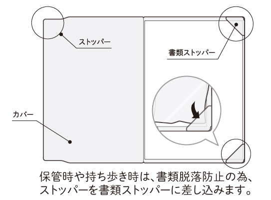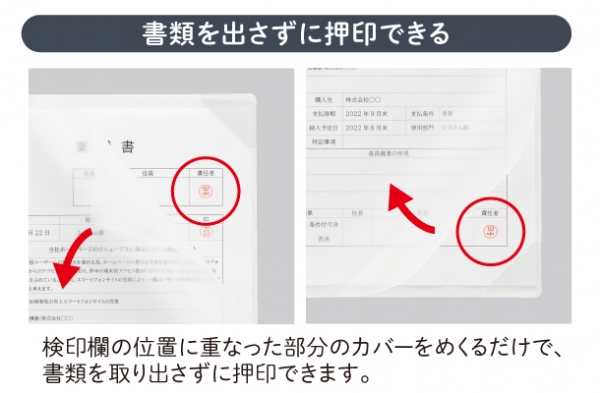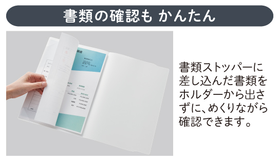 カバーを書類ストッパーに差し込んで、書類を保持する仕様のホルダーです。現在ご使用の書類の検印欄の位置に関わらず、カバーをめくるだけで簡単に押印することができます。一般的なクリヤーホルダーと異なり下部が溶着されていないため、カバーをすべて開くこともできます。書類ストッパーに差し込んだ書類はホルダーから出さずにめくって閲覧できます。