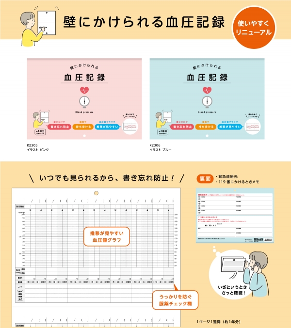 好評の「壁にかけられる血圧記録」を、更に使いやすくリニューアルいたしました。