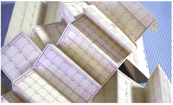 全体が片面 10 面、9折りになっています。最初と最後に当年分と来年分の全体カレンダーがあり、残りの片面 9 面に3週ずつを配置(片面 27 週)、54 週を両面で表現しています。(フィールドサイズのみ、片面 11 面 10 折り)また、週を中心に考えたフォーマットのため、月の切れ目がないデザインになっており、月末月初を連続して見られることも特徴です。