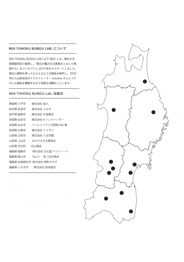 NE6 TOHOKU BUNGU LAB.( 以下 NE6) とは、東北の文房販売店で結束し、「東北の魅力を文房具をとおして発信する」をコンセプトに 2019 年からスタートしました。東北に興味を持っても らえるような商品を制作し、2020 年から山形在住のイラストレーター mizutma さんとコラボし た商品を展開するなど活発な活動をしています。