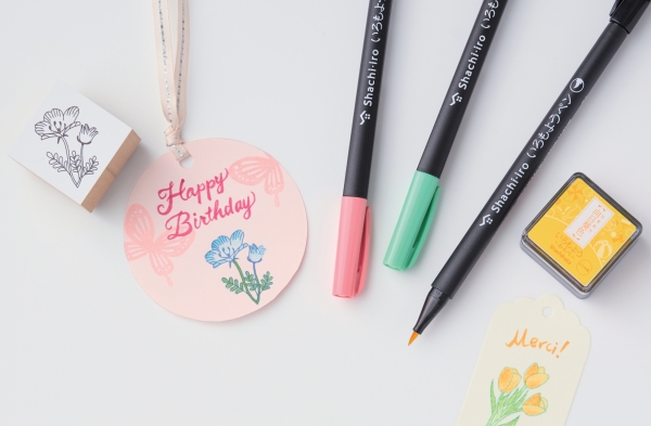 「いろもようペン」は、しなりが良く耐久性に優れた極細のブラッシュタイプのペン芯を採用した水性インキのペンで、筆圧に応じて多彩な表現ができます。「いろもよう」などの油性顔料インキでスタンプした上から色を重ねても印影がにじまないので、スタンプアートをより華やかに仕上げることができます。