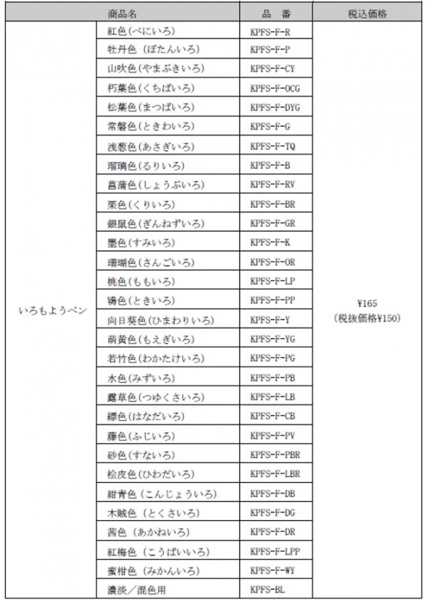 ラインナップは「いろもよう」と同じ日本の伝統色から選定した29色のカラーペンと、濃淡のグラデーションや色の混色が楽しめる濃淡/混色用ペンを加えた全30種。