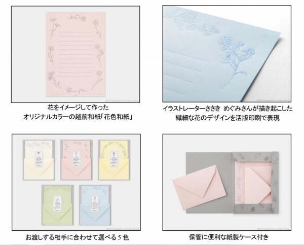 今回、5 色の「花色和紙」に、花のデザインを活版印刷で施したレターセットを新発売します。