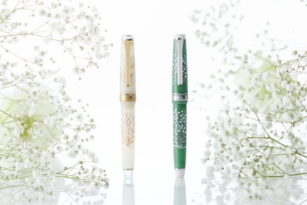 PROFESSIONALGEAR Slim Limited Edition Set Kasumiso is a sweet and charming masterpiece available only from ancōra. The pen has a slim shape and the cap top and smoothly gliding nib are embellished with baby’s breath flowers. Available in two color combinations, gold & white and silver & green, the cap and barrel are adorned with a bouquet-like motif. The set includes a limited-edition Viridian ink mixed especially for the set in the image of baby’s breath. There are seven nib sizes to choose from, ranging from Extra Fine (EF) to Music (MS).