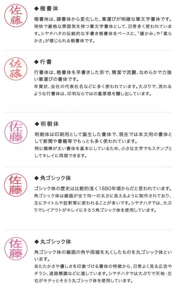 書体:楷書体、行書、明朝体、角ゴシック体、丸ゴシック体
