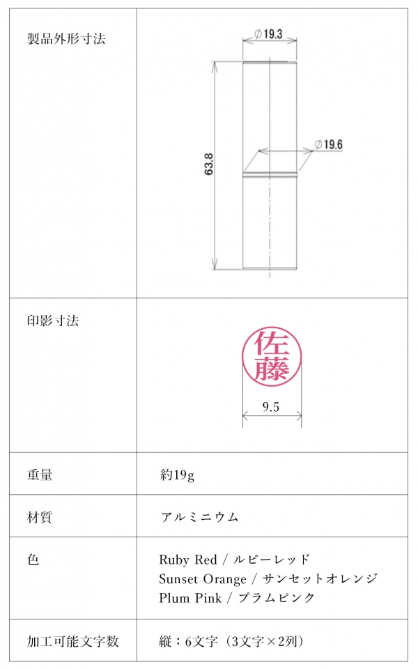 いつもの朱色だけじゃない、持つ人の魅力を引き出すインキをご用意。カラーラインナップは、シヤチハタのインキ配合技術を駆使して開発したルビーレッド、サンセットオレンジ、プラムピンクの3色。リップでも使用されるようなイエローベース、ブルーベースを意識したこだわり抜いた3色から、あなただけのリピンをお作りします。