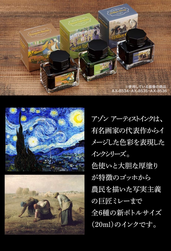 ●第2弾のインクは、色使いと大胆な厚塗りが特徴のゴッホから農民を描いた写実主義の巨匠ミレーまで全6種類のカラーが登場。サイズは20mlの新サイズになっています。